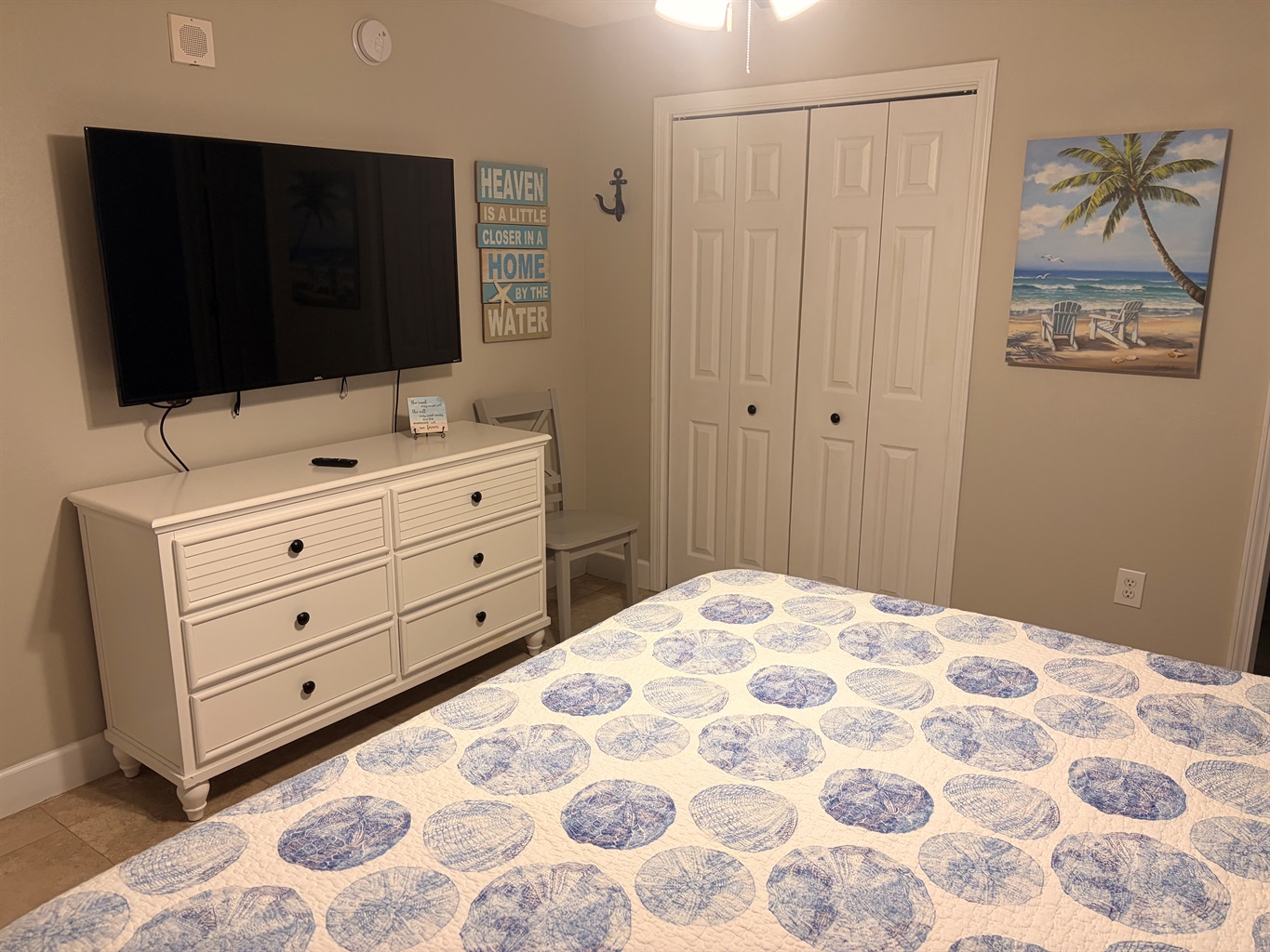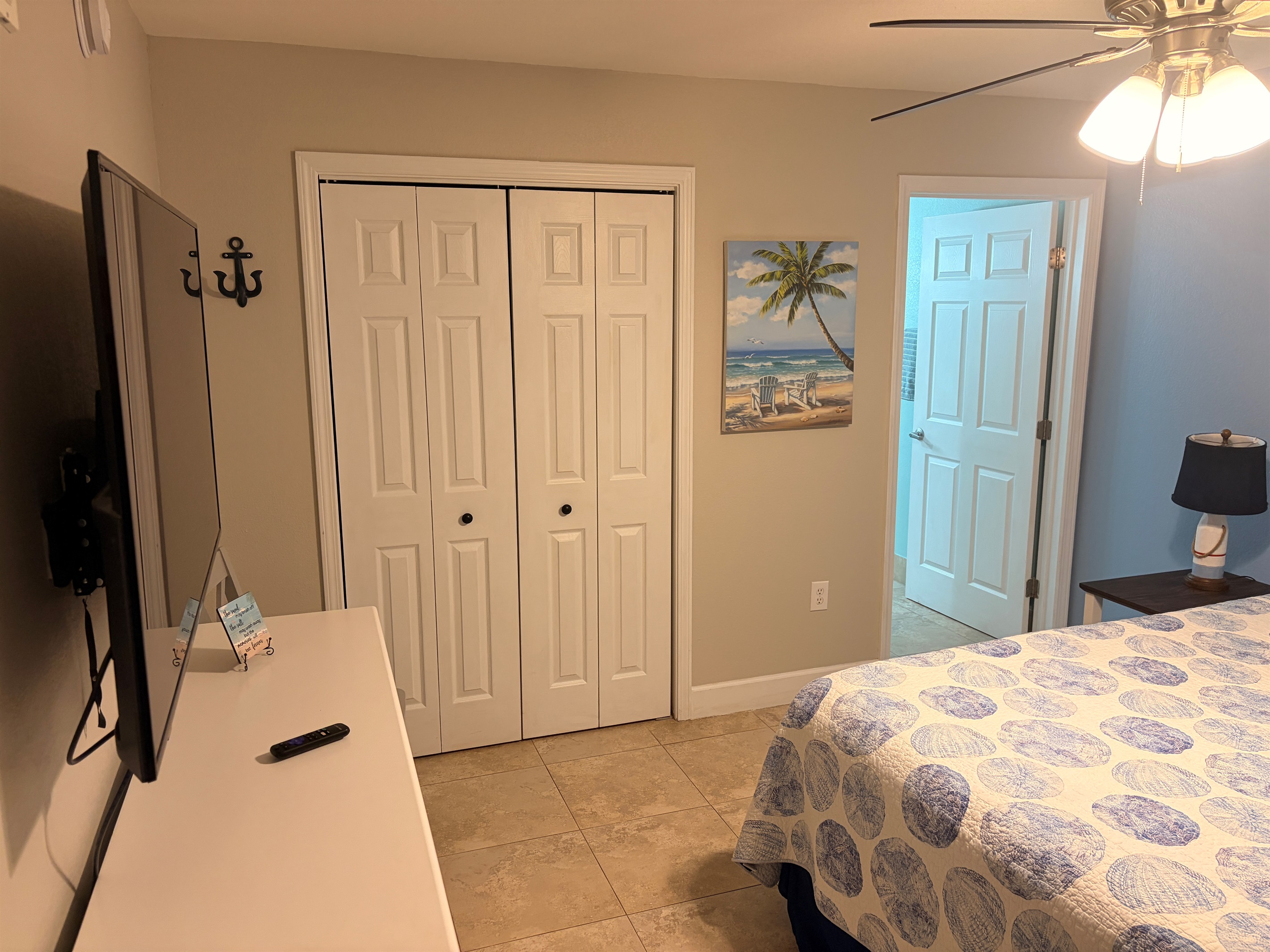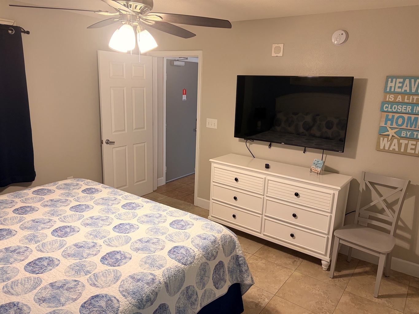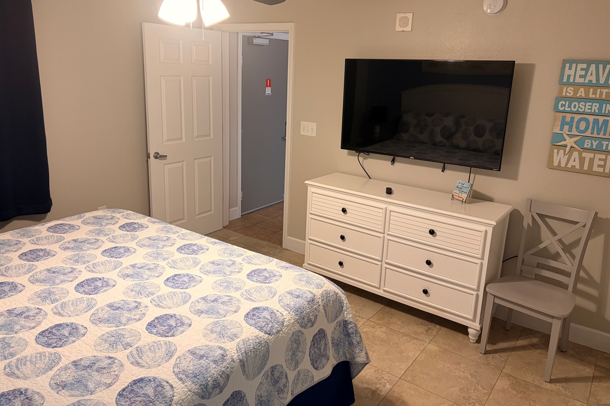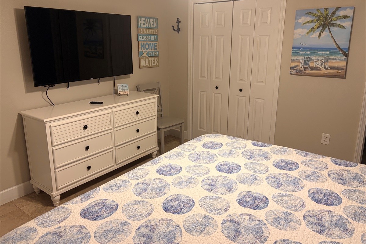 Ceiling Fan, small fan, room darkening curtains Big closet with hangers Dresser drawer, clothes Iron. |