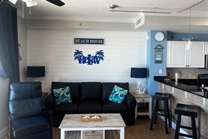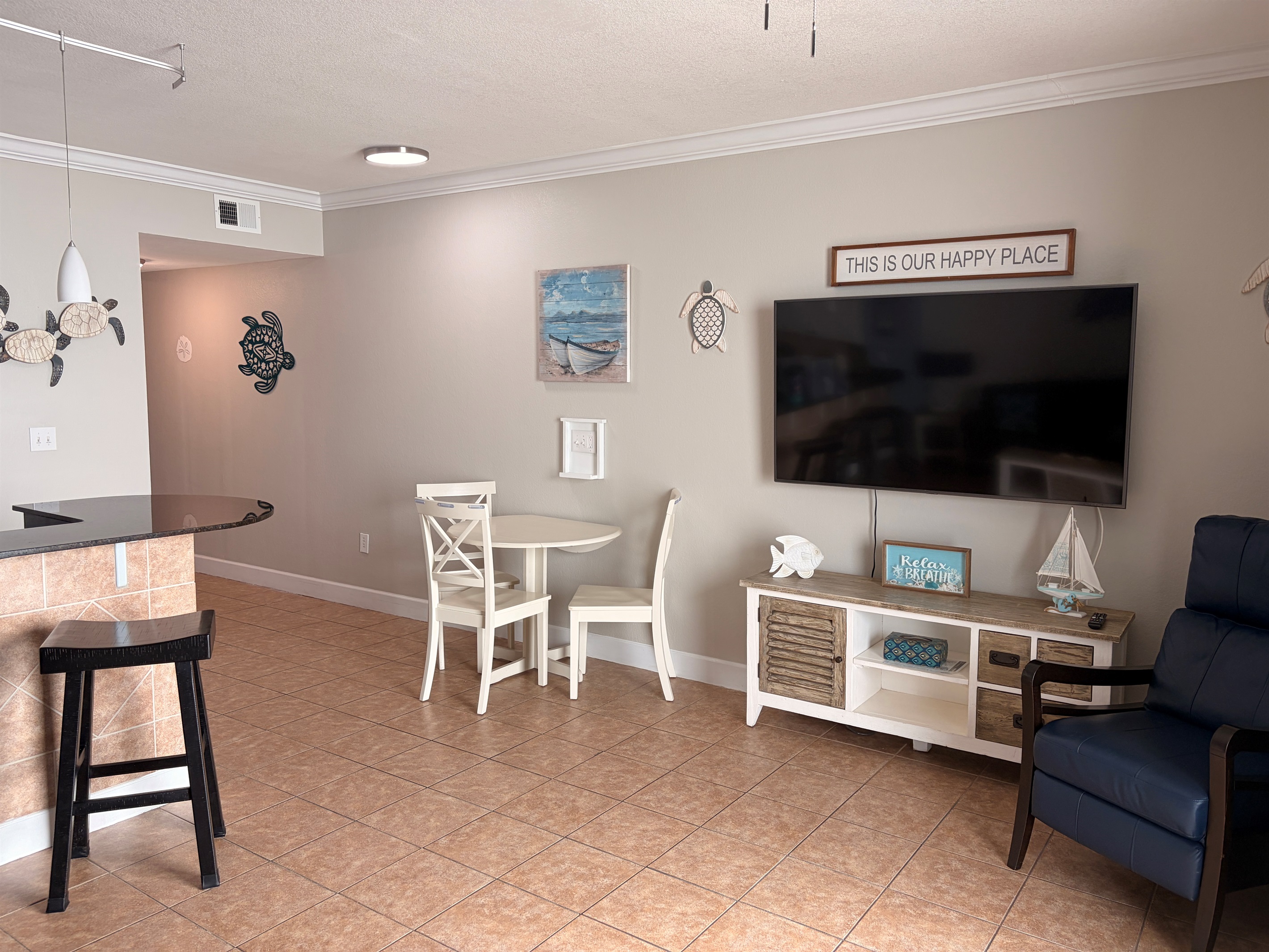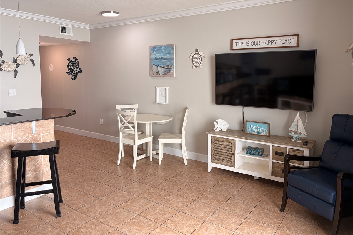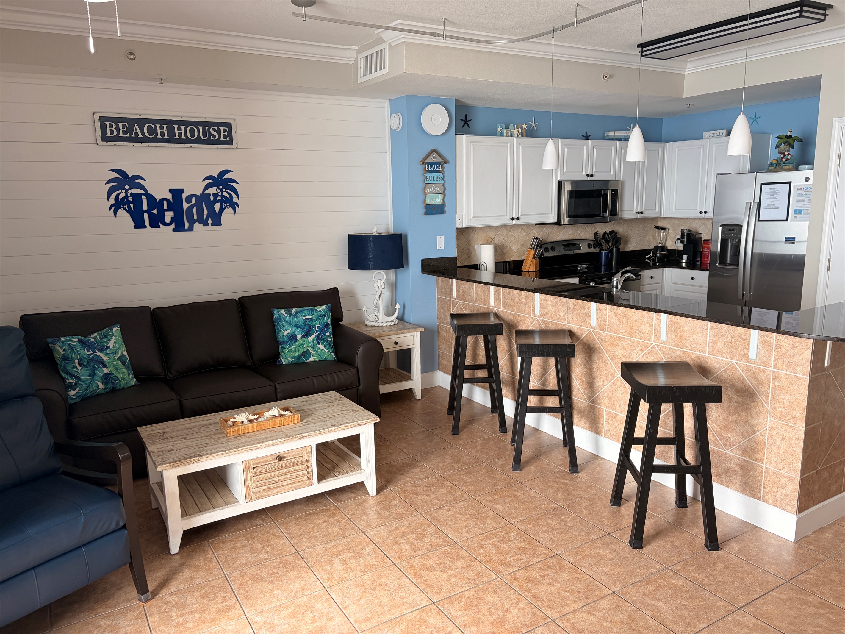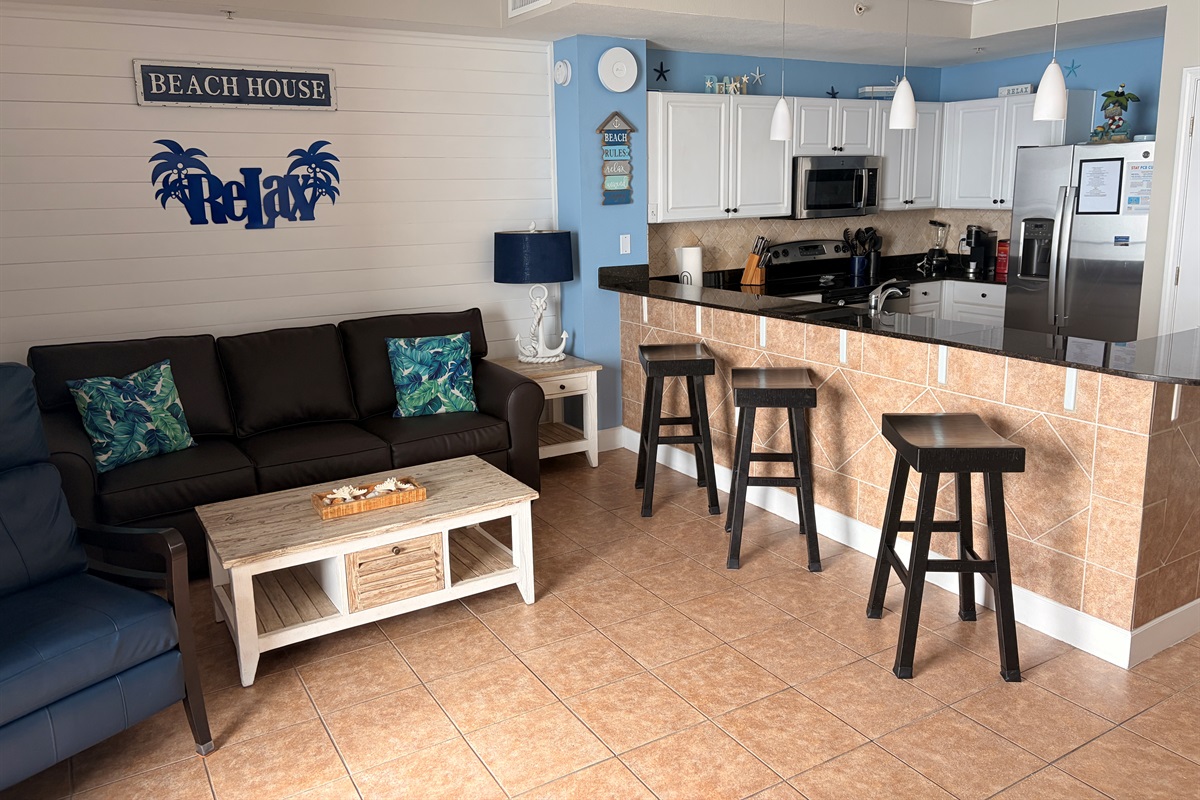 The living room you will find seating for everyone. Sofa sleeper, New Blue Chair or comfy bar stools.